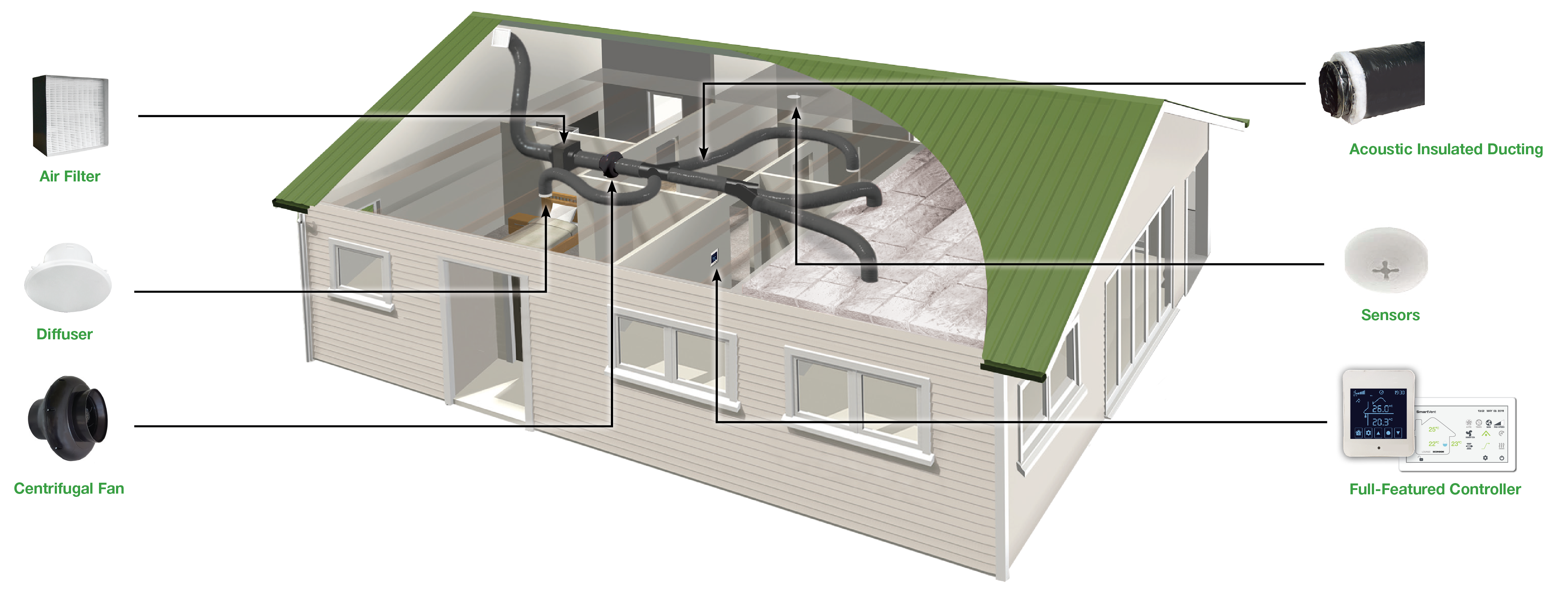 SmartVent Positive+ 新风系统是湿度感应的集中式正压系统,它可以监测家庭进气口的温度和湿度状况。SmartVent Positive+ 从空腔吸入更新鲜的空气,并进行过滤,再通过天花板上的扩散器进行扩散。SmartVent Positive+ 还有一项附加功能,即允许业主锁定该系统防止其他用户关闭,同时仍然可以进行个性化和自动化设置。
