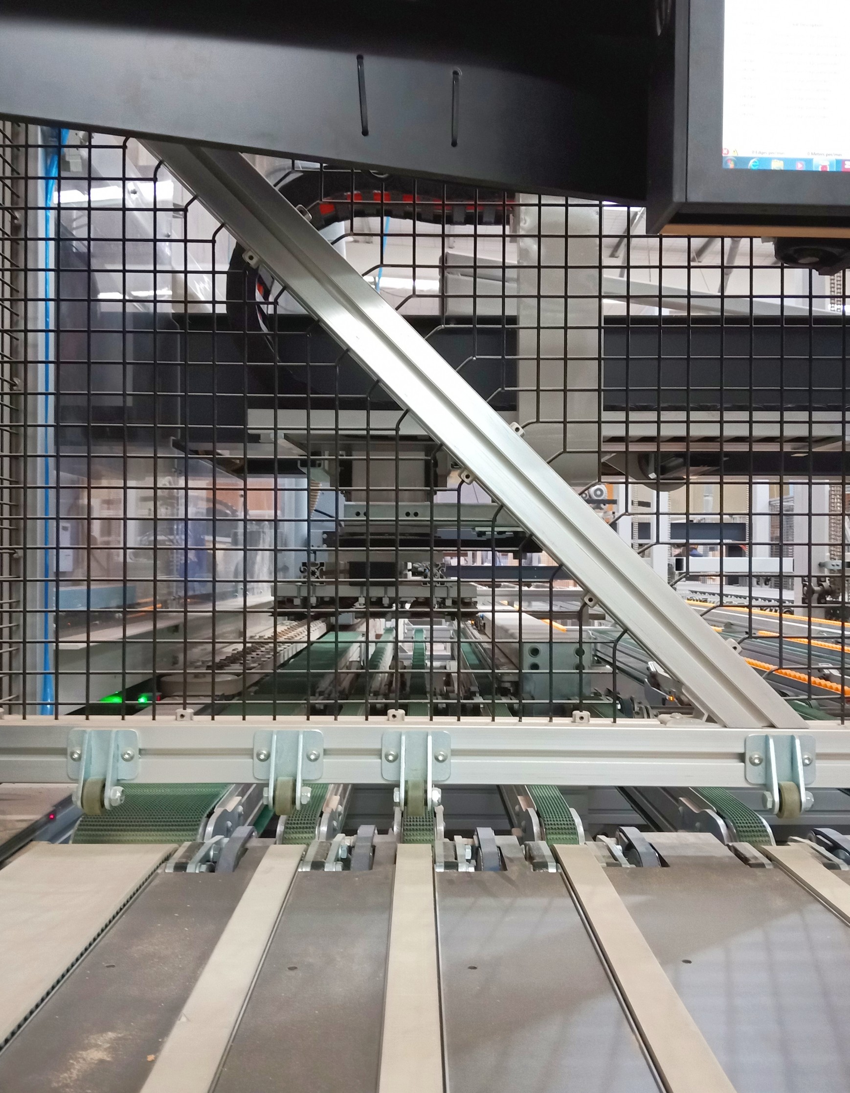 What does all this mean? After a panel is placed on the infeed conveyor and the barcode is scanned, the Edgebot remembers all the specs of the panel, including size and colour, and which edges need to be surfaced.